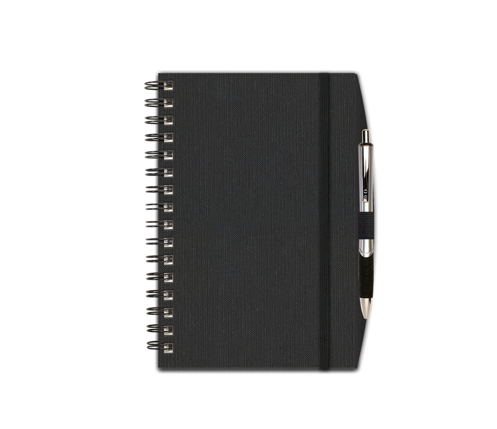 A Touch of Class. The Linen Notebook is a 7x10 notebook with 100 sheets/200 pages of quality writing paper. It features a nicely textured paper mounted to a thick paperboard front cover, a smooth black paperboard back cover including a penholder and pen with an elastic privacy closure, and black wire binding. Select either Ruled or Graph sheets. Made in the USA.